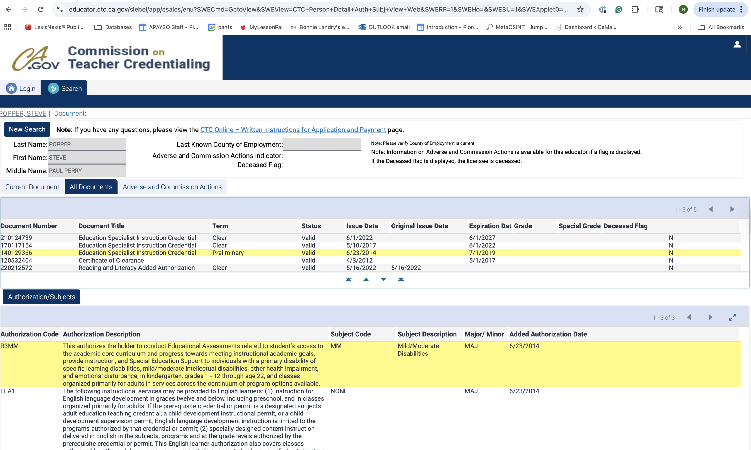 Further, the California Commission on Teacher Credentialing confirms that Popper holds an Education Specialist Instruction Credential, which authorizes him to teach special needs students, not regular needs students. He also holds a specialized autism-related credential that authorizes him to assess, provide instruction, and deliver education-related services to students with autism. Popper has been credentialed as such and authorized to teach in California since June 2014. Further, “Steve Popper” from Bemis Elementary appears in this East Valley Special Education Program Directory from 2021/2022.